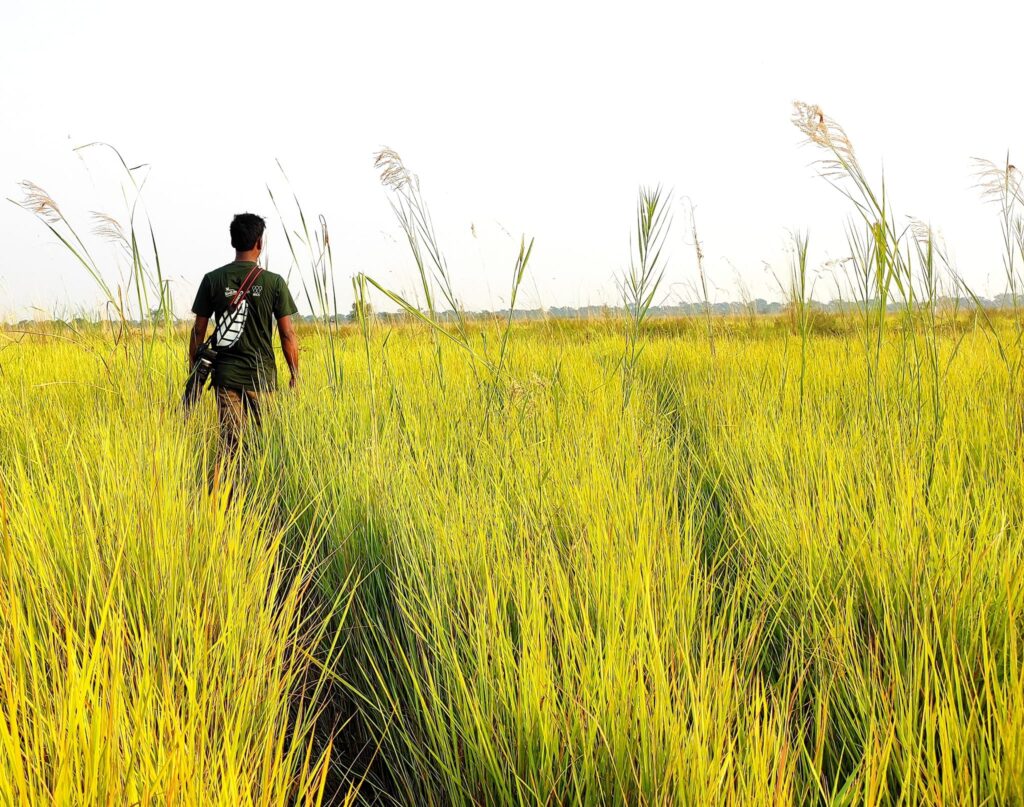 It was 2018 when conservation biologist Aditya Pal first encountered one. He was conducting fieldwork in Koshi Tappu Wildlife Reserve for his master’s thesis when a striking male materialized from the grassland and moved, unhurried, through the landscape. That single sighting set the course of his professional life.